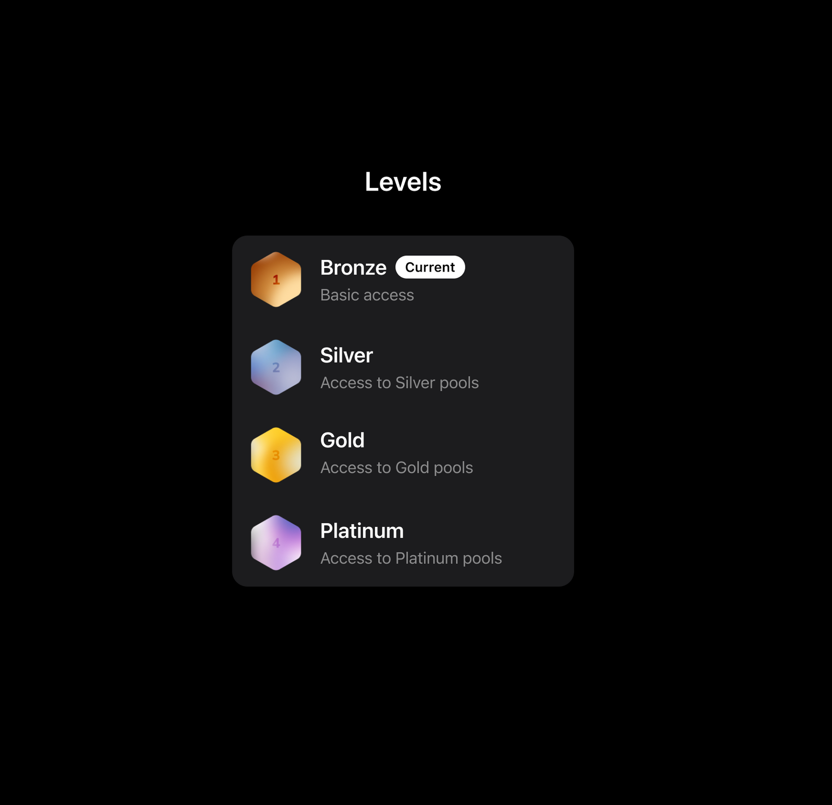 Вы можете получить уровни: Бронзовый, Серебряный, Золотой и Платиновый.