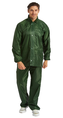 Костюм выполнен из 100% влагостойкого синтетического материала: нейлон с внутренним ПВХ покрытием. Плотность 170Т. Куртка с центральной застежкой на молнию и ветрозащитной планкой на кнопках, с капюшоном, с двумя накладными карманами с клапанами. В куртке имеются вентиляционные отверстия на спине и на уровне подмышечных впадин. Брюки прямого покроя с поясом на резинке.